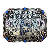 The Arizona Graduation Buckle is a unique shaped silver plated buckle that looks awesome with its accents, figurines, and accomplishments in the corners. This custom buckle has a very unique look, and the custom lettering, and figurines can be changed to whatever you need. The shimmer of this buckle will catch your eye and is a great way to show off someone’s hard work, achievement, or personalization. This buckle measures 3.5" inches tall by 4.5" inches wide normally but we have different sizes available. The back of the buckle has a hook for your belt hole. It also has a swivel bar to attach to your belt.