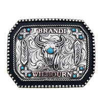 Belt buckles are a great way to advertise or show an achievement, or to personalize one for yourself. This buckle is only an example of how this buckle looks. Your buckle will be made to your specifications, lettering, stone color, etc. For example, if you see a team roper as a figurine and you would like a barrel racer, this will be changed to fit your needs. That goes for the lettering also; whatever lettering you see on the buckle is just an example and will be changed to the lettering you want.