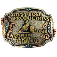 The Broomfield Buckle is an antique hand engraved background with a hint of turquoise. This custom trophy buckle has a very unique look, and the custom lettering can be changed to whatever you need. The feathers on the side with inlaid crushed turquoise will catch your eye and is a great way to show off someone’s hard work, achievement, or personalization. This buckle measures 3.5" inches tall by 4.5" inches wide. The back of the buckle has a hook for your belt hole. It also has a swivel bar to attach to your belt.