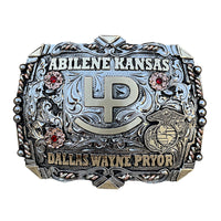 The Campo Buckle is an antique silver plated buckle with a cool border around the buckle. This custom trophy buckle has a very unique look, and the custom lettering can be changed to whatever you need. The shimmer of this buckle will catch your eye and is a great way to show off someone’s hard work, achievement, or personalization. This buckle measures 3.5" inches tall by 4.5" inches wide. The back of the buckle has a hook for your belt hole. It also has a swivel bar to attach to your belt.