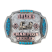 The Clifton Buckle is a unique shaped silver plated buckle that looks awesome with its beautiful Crushed Black Stone border. This custom trophy buckle has a very unique look, and the custom lettering can be changed to whatever you need. The shimmer of this buckle will catch your eye and is a great way to show off someone’s hard work, achievement, or personalization. This buckle measures 3.5" inches tall by 4.5" inches wide. The back of the buckle has a hook for your belt hole. It also has a swivel bar to attach to your belt.