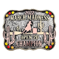 The Cave Creek Buckle is a unique shaped silver plated buckle that looks awesome with its beautiful Bead and rope border. This custom trophy buckle has a very unique look, and the custom lettering can be changed to whatever you need. The shimmer of this buckle will catch your eye and is a great way to show off someone’s hard work, achievement, or personalization. This buckle measures 3.5" inches tall by 4.5" inches wide. The back of the buckle has a hook for your belt hole. It also has a swivel bar to attach to your belt.