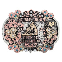 The Double Crown Buckle is a unique shaped Silver plated buckle that looks awesome with its beautiful Bead and rope border. This custom trophy buckle has a very unique look, and the custom lettering can be changed to whatever you need. The shimmer of this buckle will catch your eye and is a great way to show off someone’s hard work, achievement, or personalization. This buckle measures 3.5" inches tall by 4.5" inches wide. The back of the buckle has a hook for your belt hole. It also has a swivel bar to attach to your belt.