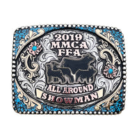 The Haverhill Buckle is a unique shaped silver plated buckle that looks awesome with its beautiful border. This custom trophy buckle has a very unique look, and the custom lettering can be changed to whatever you need. The shimmer of this buckle will catch your eye and is a great way to show off someone’s hard work, achievement, or personalization. This buckle measures 3.5" inches tall by 4.5" inches wide. The back of the buckle has a hook for your belt hole. It also has a swivel bar to attach to your belt.