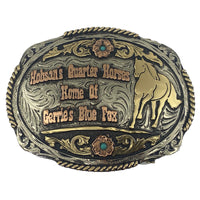 The Hobson belt buckle is a circular antique silver plated buckle designed to present your brand or logo. This custom buckle has a very unique look, and the custom lettering can be changed to whatever you need. Your lettering and brands will catch your eye and make this buckle a great choice to show off your hard work, achievement, or personalization. This buckle measures 3.5" inches tall by 4.5" inches wide. The back of the buckle has a hook for your belt hole. It also has a swivel bar to attach to your belt.