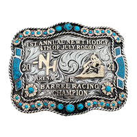 The Hodge Buckle is a unique shaped silver plated buckle that looks awesome with its beautiful stonework. This custom trophy buckle has a very unique look, and the custom lettering can be changed to whatever you need. The shimmer of this buckle will catch your eye and is a great way to show off someone’s hard work, achievement, or personalization. This buckle measures 3.5" inches tall by 4.5" inches wide. The back of the buckle has a hook for your belt hole. It also has a swivel bar to attach to your belt.