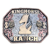 The Kinghorse Buckle is an antique German silver buckle with a new take on some of the original cowboy belt buckles. This custom trophy buckle has a very unique look, and the custom brand can be changed to whatever you need. The traditional look of this buckle will catch your eye and is a great way to show off someone’s hard work, achievement, or personalization. This buckle measures 3.5" inches tall by 4.5" inches wide. The back of the buckle has a hook for your belt hole. It also has a swivel bar to attach to your belt.