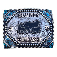 The Leawood Buckle is a unique shaped silver plated buckle that looks awesome with its beautiful border. This custom trophy buckle has a very unique look, and the custom lettering can be changed to whatever you need. The shimmer of this buckle will catch your eye and is a great way to show off someone’s hard work, achievement, or personalization. This buckle measures 3.5" inches tall by 4.5" inches wide. The back of the buckle has a hook for your belt hole. It also has a swivel bar to attach to your belt.