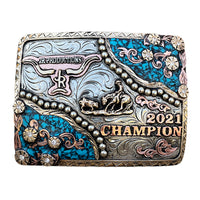 Belt buckles are a great way to advertise or show an achievement, or to personalize one for yourself. This buckle is only an example of how this buckle looks. Your buckle will be made to your specifications, lettering, stone color, etc. For example, if you see a team roper as a figurine and you would like a barrel racer, this will be changed to fit your needs. That goes for the lettering also; whatever lettering you see on the buckle is just an example and will be changed to the lettering you want.
