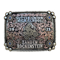 The Motocross Buckle is a unique shaped silver plated buckle that looks awesome with its logos in the center. This custom buckle has a very unique look, and the custom lettering can be changed to whatever you need. The shimmer of this buckle will catch your eye and is a great way to show off someone’s hard work, achievement, or personalization. This buckle measures 3.5" inches tall by 4.5" inches wide. The back of the buckle has a hook for your belt hole. It also has a swivel bar to attach to your belt.