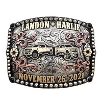 The Pickup Truck Buckle is an antique German silver buckle with a new take on some of the original cowboy belt buckles. This custom buckle has a very unique look, and the custom brand can be changed to whatever you need. The traditional look of this buckle will catch your eye and is a great way to show off someone’s hard work, achievement, or personalization. This buckle measures 3.5" inches tall by 4.5" inches wide. The back of the buckle has a hook for your belt hole. It also has a swivel bar to attach to your belt.