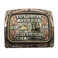 Belt buckles are a great way to advertise or show an achievement, or to personalize one for yourself. This buckle is only an example of how this buckle looks. Your buckle will be made to your specifications, lettering, stone color, etc. For example, if you see a team roper as a figurine and you would like a barrel racer, this will be changed to fit your needs. That goes for the lettering also; whatever lettering you see on the buckle is just an example and will be changed to the lettering you want.