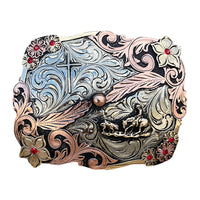The Ramona belt buckle is a square antique silver and copper plated buckle designed to present your brand or logo. This custom buckle has a very unique look, and the custom lettering can be changed to whatever you need. Your lettering and brands will catch your eye and make this buckle a great choice to show off your hard work, achievement, or personalization. This buckle measures 3.5" inches tall by 4.5" inches wide. The back of the buckle has a hook for your belt hole. It also has a swivel bar to attach to your belt.