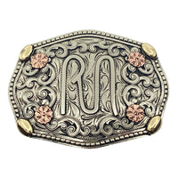 The Poppy Buckle is a square silver plated buckle that looks awesome with its Turquoise Stones . This custom buckle has a very unique look, and the custom lettering can be changed to whatever you need. The shimmer of this buckle will catch your eyeand is a great way to show off someone’s hard work, achievement, or personalization. This buckle measures 3.5" inches tall by 4.5" inches wide. The back of the buckle has a hook for your belt hole. It also has a swivel bar to attach to your belt.