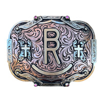The Riverview belt buckle is an antique copper plated buckle designed to present your brand or logo. This custom buckle has a very unique look, and the custom lettering can be changed to whatever you need. Your lettering and brands will catch your eye and make this buckle a great choice to show off your hard work, achievement, or personalization. This buckle measures 3.5" inches tall by 4.5" inches wide. The back of the buckle has a hook for your belt hole. It also has a swivel bar to attach to your belt.