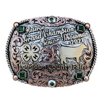 The Rockport Buckle is a unique antique silver and copper plated buckle that looks awesome with its cool border around the edge. This custom trophy buckle has a very unique look, and the custom lettering can be changed to whatever you need. The shimmer of this buckle will catch your eye and is a great way to show off someone’s hard work, achievement, or personalization. This buckle measures 3.5" inches tall by 4.5" inches wide. The back of the buckle has a hook for your belt hole. It also has a swivel bar to attach to your belt.