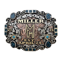 The Rushville Buckle is an antique German silver buckle with a new take on some of the original cowboy belt buckles. This custom buckle has a very unique look, and the custom brand can be changed to whatever you need. The traditional look of this buckle will catch your eye and is a great way to show off someone’s hard work, achievement, or personalization. This buckle measures 3.5" inches tall by 4.5" inches wide. The back of the buckle has a hook for your belt hole. It also has a swivel bar to attach to your belt.