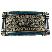 Belt buckles are a great way to advertise or show an achievement, or to personalize one for yourself. This buckle is only an example of how this buckle looks. Your buckle will be made to your specifications, lettering, stone color, etc. For example, if you see a team roper as a figurine and you would like a barrel racer, this will be changed to fit your needs. That goes for the lettering also; whatever lettering you see on the buckle is just an example and will be changed to the lettering you want.