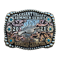 The Semi Buckle is a unique shaped silver plated buckle that looks awesome with its accents. This custom buckle has a very unique look, and the custom lettering can be changed to whatever you need. The shimmer of this buckle will catch your eye and is a great way to show off someone’s hard work, achievement, or personalization. This buckle measures 3.5" inches tall by 4.5" inches wide. The back of the buckle has a hook for your belt hole. It also has a swivel bar to attach to your belt.