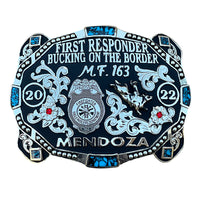 Belt buckles are a great way to advertise or show an achievement, or to personalize one for yourself. This buckle is only an example of how this buckle looks. Your buckle will be made to your specifications, lettering, stone color, etc. For example, if you see a team roper as a figurine and you would like a barrel racer, this will be changed to fit your needs. That goes for the lettering also; whatever lettering you see on the buckle is just an example and will be changed to the lettering you want.