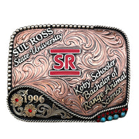 The Sul Class Buckle is a unique shaped silver plated buckle that looks awesome with its accents, figurines, and accomplishments in the corners. This custom buckle has a very unique look, and the custom lettering, and figurines can be changed to whatever you need. The shimmer of this buckle will catch your eye and is a great way to show off someone’s hard work, achievement, or personalization. This buckle measures 3.5" inches tall by 4.5" inches wide normally but we have different sizes available. The back of the buckle has a hook for your belt hole. It also has a swivel bar to attach to your belt.