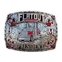 The Trucking Belt Buckle is a Square silver plated buckle that looks awesome with its silver, gold and copper combination. This custom trophy buckle has a very unique look, and the custom lettering can be changed to whatever you need. The shimmer of this buckle will catch your eye and is a great way to show off someone’s hard work, achievement, or personalization. This buckle measures 3.5" inches tall by 4.5" inches wide. The back of the buckle has a hook for your belt hole. It also has a swivel bar to attach to your belt.