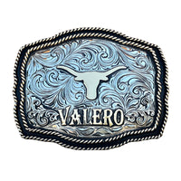 The Valero Buckle is an antique German silver buckle with a new take on some of the original cowboy belt buckles. This custom trophy buckle has a very unique look, and the custom brand can be changed to whatever you need. The traditional look of this buckle will catch your eye and is a great way to show off someone’s hard work, achievement, or personalization. This buckle measures 3.5" inches tall by 4.5" inches wide. The back of the buckle has a hook for your belt hole. It also has a swivel bar to attach to your belt.