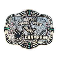 Belt buckles are a great way to advertise or show an achievement, or to personalize one for yourself. This buckle is only an example of how this buckle looks. Your buckle will be made to your specifications, lettering, stone color, etc. For example, if you see a team roper as a figurine and you would like a barrel racer, this will be changed to fit your needs. That goes for the lettering also; whatever lettering you see on the buckle is just an example and will be changed to the lettering you want.