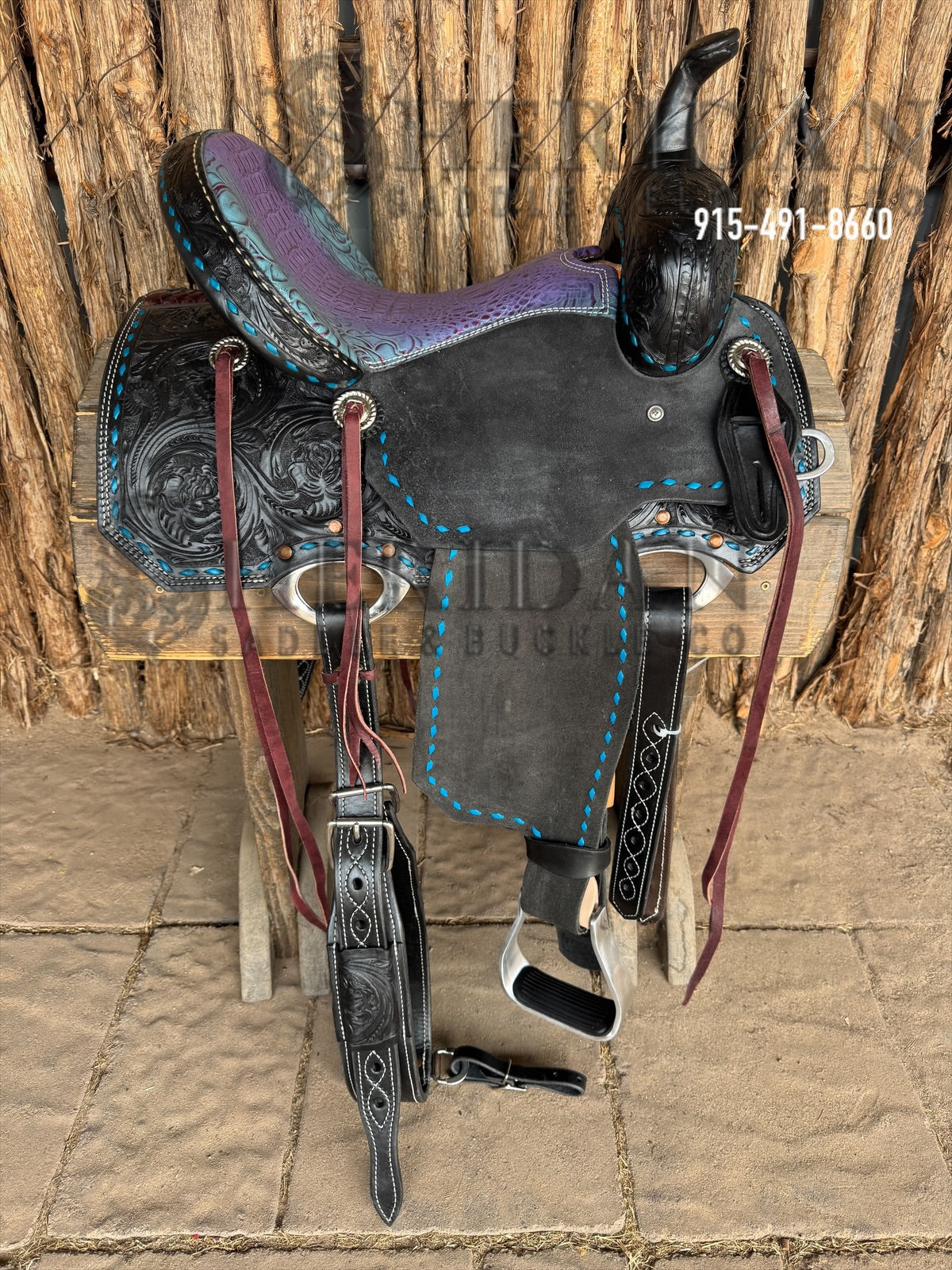 Sheridan Saddle Co. brings to you barrel saddles that are usable, beautiful and affordable. This particular barrel saddle does just that. This saddle has a tall and deep seat to hold you in the saddle. The seat on this saddle is made to spend hours in the saddle riding your horse or waiting for your turn to run. The beautiful roughout helps hold you in the saddle while running fast or breaking colts. This saddle is made for anyone who is looking for a lightweight barrel saddle to throw on your horse with ease or the barrel racing warrior ready to saddle up horses ready to race. This saddle is ready to put to work training colts and fillies or trail ride and enjoy the day. The choice is yours.