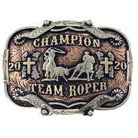 Belt buckles are a great way to advertise or show an achievement, or to personalize one for yourself. This buckle is only an example of how this buckle looks. Your buckle will be made to your specifications, lettering, stone color, etc. For example, if you see a team roper as a figurine and you would like a barrel racer, this will be changed to fit your needs. That goes for the lettering also; whatever lettering you see on the buckle is just an example and will be changed to the lettering you want.
