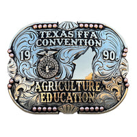 The Agriculture Graduation Buckle is a unique shaped silver plated buckle that looks awesome with its accents, figurines, and accomplishments in the corners. This custom buckle has a very unique look, and the custom lettering, and figurines can be changed to whatever you need. The shimmer of this buckle will catch your eye and is a great way to show off someone’s hard work, achievement, or personalization. This buckle measures 3.5" inches tall by 4.5" inches wide normally but we have different sizes available. The back of the buckle has a hook for your belt hole. It also has a swivel bar to attach to your belt.