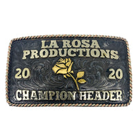 Belt buckles are a great way to advertise or show an achievement, or to personalize one for yourself. This buckle is only an example of how this buckle looks. Your buckle will be made to your specifications, lettering, stone color, etc. For example, if you see a team roper as a figurine and you would like a barrel racer, this will be changed to fit your needs. That goes for the lettering also; whatever lettering you see on the buckle is just an example and will be changed to the lettering you want.