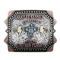 The Amherst Buckle is a unique shaped silver plated buckle that looks awesome with its beautiful Crushed Black Stone border. This custom trophy buckle has a very unique look, and the custom lettering can be changed to whatever you need. The shimmer of this buckle will catch your eye and is a great way to show off someone’s hard work, achievement, or personalization. This buckle measures 3.5" inches tall by 4.5" inches wide. The back of the buckle has a hook for your belt hole. It also has a swivel bar to attach to your belt.