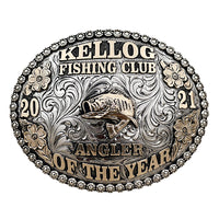 The Angler Buckle is a unique shaped silver plated buckle that looks awesome with its engraving . This custom buckle has a very unique look, and the custom lettering can be changed to whatever you need. The shimmer of this buckle will catch your eye and is a great way to show off someone’s hard work, achievement, or personalization. This buckle measures 3.5" inches tall by 4.5" inches wide. The back of the buckle has a hook for your belt hole. It also has a swivel bar to attach to your belt.