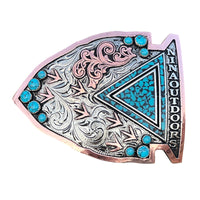 The Arrowhead Buckle is an antique German silver buckle with a new take on some of the original cowboy belt buckles. This custom  buckle has a very unique look, and the custom brand can be changed to whatever you need. The traditional look of this buckle will catch your eye and is a great way to show off someone’s hard work, achievement, or personalization. This buckle measures 3.5" inches tall by 4.5" inches wide. The back of the buckle has a hook for your belt hole. It also has a swivel bar to attach to your belt.
