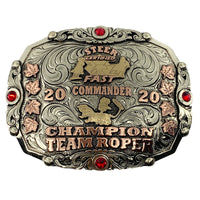 Belt buckles are a great way to advertise or show an achievement, or to personalize one for yourself. This buckle is only an example of how this buckle looks. Your buckle will be made to your specifications, lettering, stone color, etc. For example, if you see a team roper as a figurine and you would like a barrel racer, this will be changed to fit your needs. That goes for the lettering also; whatever lettering you see on the buckle is just an example and will be changed to the lettering you want.