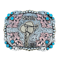 Belt buckles are a great way to advertise or show an achievement, or to personalize one for yourself. This buckle is only an example of how this buckle looks. Your buckle will be made to your specifications, lettering, stone color, etc. For example, if you see a team roper as a figurine and you would like a barrel racer, this will be changed to fit your needs. That goes for the lettering also; whatever lettering you see on the buckle is just an example and will be changed to the lettering you want.