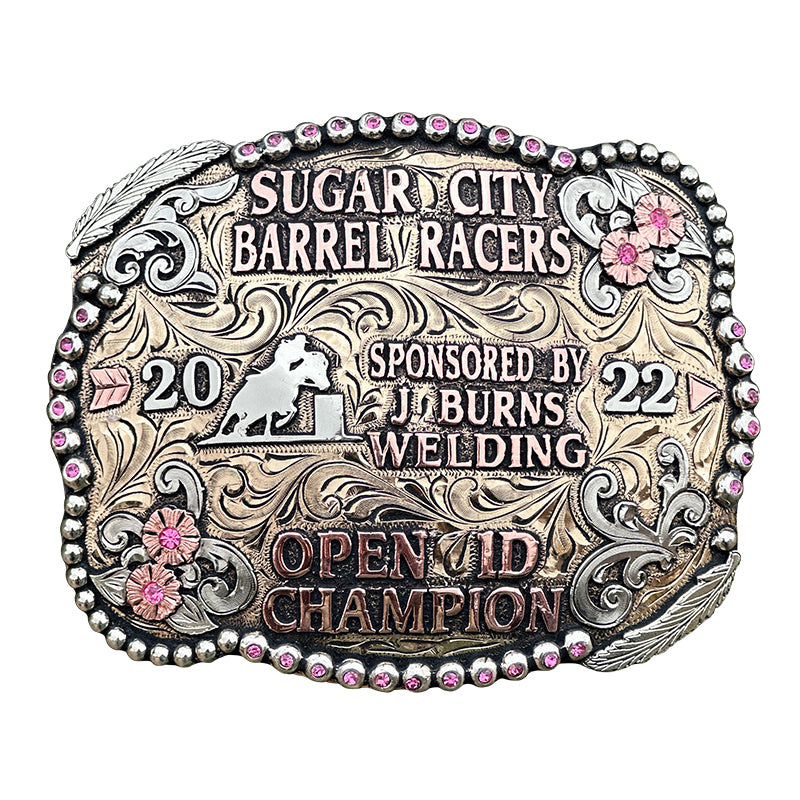 Belt buckles are a great way to advertise or show an achievement, or to personalize one for yourself. This buckle is only an example of how this buckle looks. Your buckle will be made to your specifications, lettering, stone color, etc. For example, if you see a team roper as a figurine and you would like a barrel racer, this will be changed to fit your needs. That goes for the lettering also; whatever lettering you see on the buckle is just an example and will be changed to the lettering you want.