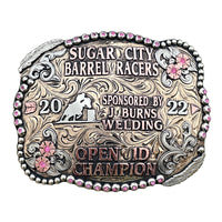 The Belmar Buckle is a unique shaped Silver plated buckle that looks awesome with its beautiful Bead and rope border. This custom trophy buckle has a very unique look, and the custom lettering can be changed to whatever you need. The shimmer of this buckle will catch your eye and is a great way to show off someone’s hard work, achievement, or personalization. This buckle measures 3.5" inches tall by 4.5" inches wide. The back of the buckle has a hook for your belt hole. It also has a swivel bar to attach to your belt.
