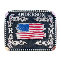 The Boston Buckle is an antique German silver buckle with a new take on some of the original cowboy belt buckles. This custom buckle has a very unique look, and the custom brand can be changed to whatever you need. The traditional look of this buckle will catch your eye and is a great way to show off someone’s hard work, achievement, or personalization. This buckle measures 3.5" inches tall by 4.5" inches wide. The back of the buckle has a hook for your belt hole. It also has a swivel bar to attach to your belt.