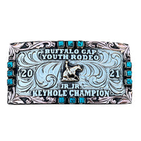 The Bozeman Box trophy belt buckle is a rectangular shaped buckle designed to fit a belt perfect. This custom trophy buckle has a very unique look, and the custom lettering can be changed to whatever you need. The smaller sleeker shape of the box buckles will edge catch your eye and is a great way to show off someone’s hard work, achievement, or personalization. This buckle measures 2" inches tall by 4" inches wide. The back of the buckle has a hook for your belt hole. It also has a swivel bar to attach to your belt.
