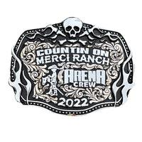 Belt buckles are a great way to advertise or show an achievement, or to personalize one for yourself. This buckle is only an example of how this buckle looks. Your buckle will be made to your specifications, lettering, stone color, etc. For example, if you see a team roper as a figurine and you would like a barrel racer, this will be changed to fit your needs. That goes for the lettering also; whatever lettering you see on the buckle is just an example and will be changed to the lettering you want.