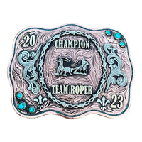 Belt buckles are a great way to advertise or show an achievement, or to personalize one for yourself. This buckle is only an example of how this buckle looks. Your buckle will be made to your specifications, lettering, stone color, etc. For example, if you see a team roper as a figurine and you would like a barrel racer, this will be changed to fit your needs. That goes for the lettering also; whatever lettering you see on the buckle is just an example and will be changed to the lettering you want.