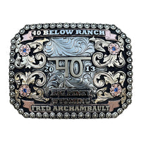 The Tussle Buckle is a unique antique silver and copper plated buckle that looks awesome with its cool border around the edge. This custom trophy buckle has a very unique look, and the custom lettering can be changed to whatever you need. The shimmer of this buckle will catch your eye and is a great way to show off someone’s hard work, achievement, or personalization. This buckle measures 3.5" inches tall by 4.5" inches wide. The back of the buckle has a hook for your belt hole. It also has a swivel bar to attach to your belt.