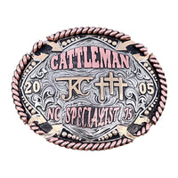 The Cattleman Buckle is an antique German silver buckle with a new take on some of the original cowboy belt buckles. This custom buckle has a very unique look, and the custom lettering can be changed to whatever you need. The traditional look of this buckle will catch your eye and is a great way to show off someone’s hard work, achievement, or personalization. This buckle measures 3.5" inches tall by 4.5" inches wide. The back of the buckle has a hook for your belt hole. It also has a swivel bar to attach to your belt.