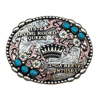 The Celoron Buckle is a unique shaped Silver plated buckle that looks awesome with its beautiful Bead and rope border. This custom trophy buckle has a very unique look, and the custom lettering can be changed to whatever you need. The shimmer of this buckle will catch your eye and is a great way to show off someone’s hard work, achievement, or personalization. This buckle measures 3.5" inches tall by 4.5" inches wide. The back of the buckle has a hook for your belt hole. It also has a swivel bar to attach to your belt.
