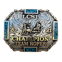 Belt buckles are a great way to advertise or show an achievement, or to personalize one for yourself. This buckle is only an example of how this buckle looks. Your buckle will be made to your specifications, lettering, stone color, etc. For example, if you see a team roper as a figurine and you would like a barrel racer, this will be changed to fit your needs. That goes for the lettering also; whatever lettering you see on the buckle is just an example and will be changed to the lettering you want.