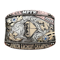 The Choke Buckle is a unique shaped silver plated buckle that looks awesome with its logos in the center. This custom buckle has a very unique look, and the custom lettering can be changed to whatever you need. The shimmer of this buckle will catch your eye and is a great way to show off someone’s hard work, achievement, or personalization. This buckle measures 3.5" inches tall by 4.5" inches wide. The back of the buckle has a hook for your belt hole. It also has a swivel bar to attach to your belt.