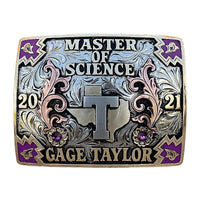 The Class Buckle is a Square silver plated buckle that looks awesome with its Turquoise Stones. This custom buckle has a very unique look, and the custom lettering can be changed to whatever you need. The shimmer of this buckle will catch your eye and is a great way to show off someone’s hard work, achievement, or personalization. This buckle measures 3.5" inches tall by 4.5" inches wide. The back of the buckle has a hook for your belt hole. It also has a swivel bar to attach to your belt.