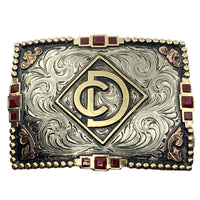 The Conway belt buckle is a square antique silver plated buckle designed to present your brand or logo. This custom buckle has a very unique look, and the custom lettering can be changed to whatever you need. Your lettering and brands will catch your eye and make this buckle a great choice to show off your hard work, achievement, or personalization. This buckle measures 3.5" inches tall by 4.5" inches wide. The back of the buckle has a hook for your belt hole. It also has a swivel bar to attach to your belt.